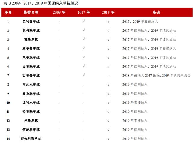 我国基本医疗报销的报销范围在向临床价值高的单抗等创新药物倾斜。人社部 2017 年 7 月发布《人力资源社会保障部关于将 36 种药品纳入国家基本医疗保险、工伤保险和生育保险药品目录乙类范围的通知》,将 36 种谈判药品纳入国家 2017 年医保目录,其中包含曲妥珠单抗等 5 个单抗药物。2018 年 10 月,国家医保局印发《关于将 17 种抗癌药纳入国家基本医疗保险、工伤保险和生育保险药品目录乙类范围的通知》,将西妥昔单抗纳入国家医保目录。2019 年 11 月,国家医保局、人力资源社会保障部印发《关于将 2019 年谈判药品纳入<国家基本医疗保险、工伤保险和生育保险药品目录>乙类范围的通知》,将 97 种临床价值较高的谈判药品纳入国家 2019 年医保目录,其中涉及英夫利昔单抗等 9 种单抗药品。政策支持下,单抗药物已从 2009 年医保的零纳入升至 2019 年医保的 13 个,比 2017 年的 7 个翻了近一倍。单抗药物纳入医保后,一般 60%-70%的费用由医保报销,且药品价格出现大幅下降,患者整体支付压力大幅下降,进而实现快速放量。医保对单抗药物覆盖持续扩容,将加速单抗药物市场空间的释放。
