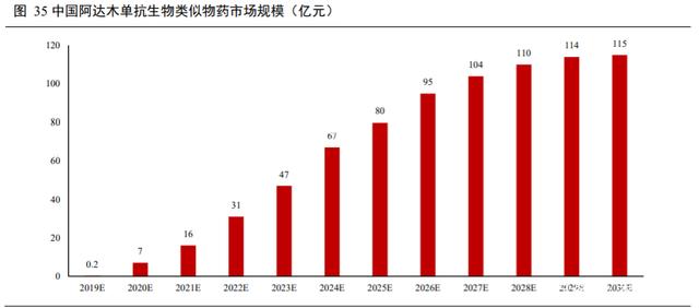 4 款 TNF-α 单抗国内均有上市。国产方面,百奥泰及海正药业的国产阿达木单抗类似物均已于 2019 年底获批上市;研发进度较快的信达生物、复宏汉霖、君实生物、迈博太科已处于上市申请阶段;依据 Insight数据库,目前国内正在进行 TNF-α 单抗临床试验的有 29 项,其中处于 I 期临床试验的有 12 项,II 期临床试验 1 项,III 期临床试验 7 项,其他临床试验 3 项,国产 TNF-α 单抗主要集中于类似物的研发,涉及临床试验达 19 项,商品 12 种,其中百迈博、精鼎医药、通化东宝、神州细胞及华兰生物均已进入 III 期临床试验阶段。国产 TNF-α 单抗市场即将进入激烈竞争阶段,预计随着类似物的陆续上市,中国市场 TNF-α 单抗渗透率将快速提高,市场规模有望快速提升,依据预计弗若斯特沙利文报告分析,预计阿达木单抗类似物于 2023 年将达到 47 亿元,2019 年到 2023 年的年复合增长率为 291.4%,预计 2030 年将达到 115 亿元,2023年到 2030 年的年复合增长率为 13.7%。