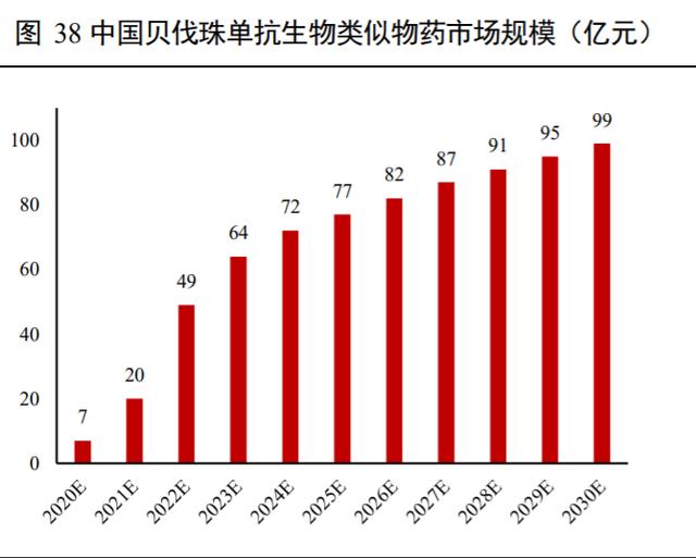 目前国内上市的 VEGF 单抗共有 2 款,分别为贝伐珠单抗与雷珠单抗,均已纳入医保,2016-2018 年贝伐珠单抗在中国的销售额分别为 15 亿元、17 亿元和 32 亿元。国产方面,齐鲁制药的贝伐珠单抗类似物已于 2019 年底上市;研发进度较快的绿叶制药、恒瑞医药及信达生物的贝伐珠单抗类似物已处于上市申请阶段;依据 Insight 数据库,目前国内正在进行 VEGF 单抗临床试验的有 57 项,其中处于 I 期临床试验的有31 项,II 期临床试验 2 项,III 期临床试验 29 项,其他临床试验 3 项,国产 VEGF 单抗主要集中于类似物(主要为贝伐珠单抗)的研发,涉及临床试验高达 32 项,商品 21 种,其中复宏汉霖、安科生物、华兰生物等多家企业均已进入 III 期临床试验阶段。预计随着中国上市的贝伐珠单抗生物类似药数量的增加,中国贝伐珠单抗生物类似药的市场规模将呈稳步增长,依据预计弗若斯特沙利文报告分析,该市场于 2023 年增至 64 亿人民币,并于 2030 年达到 99 亿人民币规模。