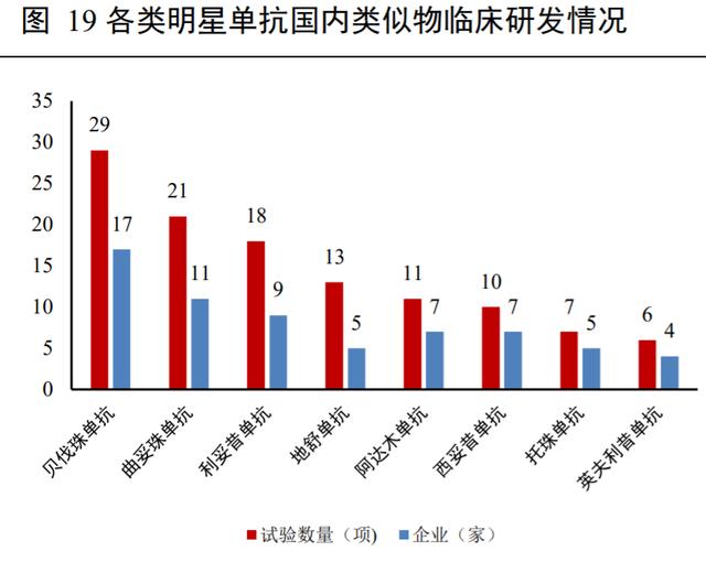 生物类似物相对原研单抗,研发周期、成本及难度较低,随着近年多个明星单抗产品专利的陆续到期,类似物也成为国内单抗研发的热门领域,依据 Insight 数据,截止目前,国内单抗类似物正在进行的临床试验有 142 项,涉及明星产品贝伐珠单抗、曲妥珠单抗、阿达木单抗、利妥昔单抗等较多,竞争较为激烈。