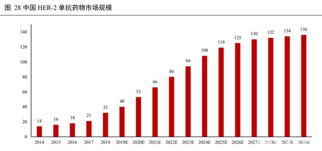 目前 2 款 HER-2 单抗均已在中国上市,曲妥珠单抗于 2002 年在中国获批上市,获批适应症包括 HER-2阳性早期/转移性乳腺癌和 HER- 阳性转移性胃癌,并进入 2019 年国家医保目录乙类;帕妥珠单抗于 2018年在中国获批上市,获批适应症为与曲妥珠单抗和化疗联合作为具有高复发风险 HER-2 阳性早期乳腺癌患者的辅助/新辅助治疗。依据弗若斯特沙利文报告分析,中国 HER-2 单抗药物市场已从 2014 年的约 14 亿元增长至 2018 年的约 32 亿元,期间复合年增长率为 23.9%。随着乳腺癌新药的加速上市,更多新药和生物类似药的可及性提高,抗 HER-2 单抗药物市场未来将快速发展,预计在 2023 年、2030 年分别达到约 94亿元、136 亿元的市场规模。