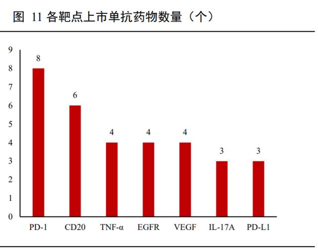 依据 Insight 数据库,截至目前全球批准上市的单抗药品共计 91 个(不包括抗体偶联物、融合蛋白及撤市产品,不同数据库统计或有差异),随着技术的发展及研发投入的扩大,近几年单抗上市明显加速,2015年以来上市的就有 47 个,超过总上市数量的一半,其中 2018 年单年上市的就达到 13 个,为近年来最大值。上市单抗涉及靶点种类多样,超 70 个以上,其中 PD-1 单抗 8 个,为上市品种最多的靶点,其次为 CD20,上市 6 个品种,TNF-α、EGFR、VEGF 分别上市 4 个品种。