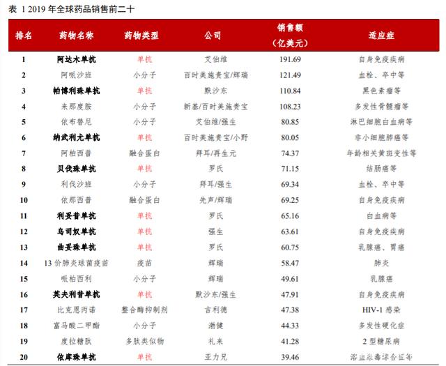 抗体药物主要包括单克隆抗体(以下简称“单抗”)、ADC(Antibody-Drug Conjugates,抗体药物偶联物)、双特异性抗体、Fc 融合蛋白等。其中单抗是生物药的最大类别,2018 年销售额占全球生物药市场比重高达55.3%。此外,在 2019 年全球销售额前二十的药品中,13 个生物药中单抗就占据 9 席,单抗目前是全球制药市场最重要的细分领域之一。