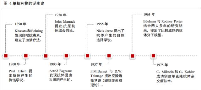 (1) 单抗药物的诞生史(1890-1975 年):1890 年,Kitasato 和 Behring 在血清中发现白喉抗毒素,也就是最早发现的抗体。此后经历了一段漫长的历史进程,科学家们逐渐对抗原抗体识别机理以及抗体的结构有了深入的了解。1975 年,C.Milstein 和 G.Kohler 创立了杂交瘤技术,并制备得到首个治疗性单克隆抗体-OKT3(Ortholone),两人也因此于 1984 年获得了诺贝尔奖,为规模化生产特异性高、结构与性质均一稳定的单克隆抗体提供了有力保障。从血清治疗到单抗药物的诞生经历了80 多年,一般认为这也是抗体发展的第一时代
