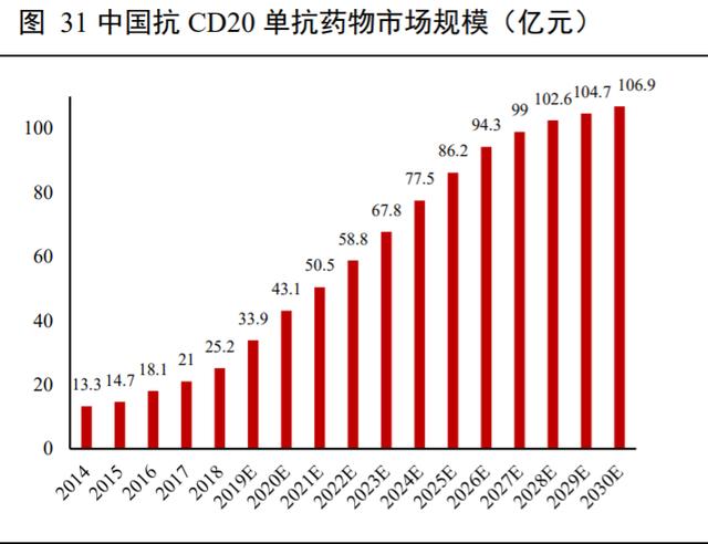 目前国内上市的 CD20 单抗仅利妥昔单抗一种,并已纳入医保。国产方面,复宏汉霖的利妥昔单抗类似物于 2019 年 2 月获批上市,为中国首个上市的生物类似物,获批适应症为非霍奇金淋巴瘤;研进度较快的信达生物与神州细胞也已处于上市申请阶段;依据 Insight 数据库,目前国内正在进行 CD20 单抗临床试验的有 28 项,其中处于 I 期临床试验的有 13 项,II 期临床试验 2 项,III 期临床试验 10 项,其他临床试验 3项,国产 CD20 单抗主要集中于利妥昔单抗类似物的研发,涉及临床试验达 18 项,商品 9 种,其中优科生物、中国生物制药、华兰生物、上海所均处于临床 III 期试验阶段,未来国内 CD20 单抗类似物竞争激烈。预计随着国产 CD20 单抗的陆续上市,国内市场也将快速成长,依据弗若斯特沙利文报告分析,中国抗 CD20单抗药市场将以 21.9%的年复合增长率,由 2018 年的 25.2 亿增长至 2023 年的 67.8 亿。并在之后几年里保持平稳增长,以 6.7%的年复合增长率于 2030 年达到 106.9 亿人民币。