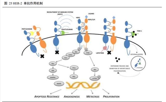 抗 HER-2 单克隆抗体通过将自身附着在 HER-2 上来阻止人体表皮生长因子在 HER-2 上的附着,从而阻断癌细胞的生长,并可以刺激人体自身的免疫细胞去摧毁癌细胞,其作用机理包括:(1)抗 HER-2 单抗可以结合 HER2 的细胞外结构域,并且在与受体结合后,下调 HER-2 的表达;(2)与 HER-2 结合后,抗HER-2 单抗下调了 PI3K 通路信号传导和细胞周期进展的下游介质,例如细胞周期蛋白 D1;(3)抗 HER-2单抗不仅抑制 HER-2 信号传导途径,还引发针对 HER-2 过表达细胞的免疫介导的应答。