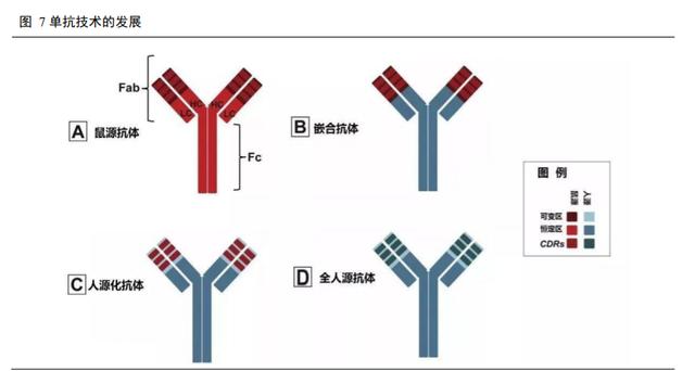 人鼠嵌合单抗:人鼠嵌合抗体是指鼠源抗体的恒定区被人抗体的恒定区所取代,保留鼠单抗的可变区序列,形成所谓的人鼠嵌合抗体。1984 年 Morrison 等人将鼠单抗可变区与人 IgG 恒定区在基因水平上连接在一起,成功构建了第一代人-鼠嵌合抗体。1994 年全球首个嵌合抗体阿昔单抗上市,冲淡行业悲观情绪。1997 年全球第一个治疗肿瘤的明星嵌合抗体利妥昔单抗上市,用于治疗非霍奇金氏淋巴瘤。嵌合抗体虽然可以部分解决异种蛋白的排斥问题,但其鼠源可变区依然可能会诱发人抗鼠抗体反应,干扰疗效。