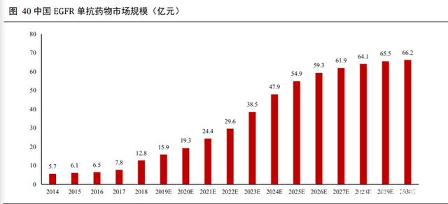 国内目前有 2 款 EGFR 单抗药物上市,分别为西妥昔单抗及尼妥珠单抗,均已进入医保,并迎来迅速的销售增长,两者在鼻咽癌和结直肠癌中的治疗渗透率分别在其进入医保当年提升 121.4%和 239.5%。尼妥珠单抗是我国第一个用于治疗恶性肿瘤的功能性单抗药物,商品名为泰欣生,临床上主要试用于与放疗联合治疗表皮生长因子受体 (EGFR) 表达阳性的 III/IV 期鼻咽癌。依据 Insight 数据库,目前国内正在进行EGFR 单抗临床试验的有 33 项,其中处于 I 期临床试验的有 16 项,II 期临床试验 4 项,III 期临床试验 9项,其他临床试验 4 项。国产 EGFR 单抗类似物的研发主要为西妥昔单抗,涉及临床试验达 9 项,商品 7种,其中迈博太科、科伦药业、安普泽均已进入 III 期临床试验阶段。依据预计弗若斯特沙利文报告分析,中国抗 EGFR 单抗药物市场由 2014 年的 5.7 亿人民币增长至 2018 年的 12.8 亿人民币,期间年复合增长率为 22.4%。预计在未来,中国抗 EGFR 单抗药物市场将持续增长,在 2023 年以 24.6%的年复合增长率增长至 38.5 亿人民币,并于 2030 年达到 66.2 亿人民币,期间年复合增长率为 8.0%。