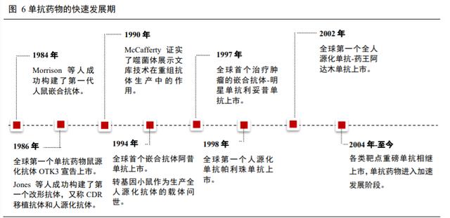 (2)单抗药物的快速发展期(1975-至今):自第一代单克隆抗体诞生后,单抗药物发展进入快速发展时期,即单抗药物发展的第二时代。经过 40 多年来抗体库技术的的不断完善,单抗药物的制备、研究和应用已逐步进入了健康发展的轨道,如今单抗药物在肿瘤、免疫系统疾病等领域的治疗上已取得重大进展。