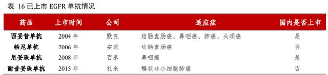 目前全球范围内共有 4 款 EGFR 单抗获批上市,其中西妥昔单抗作为重组抗 EGFR 嵌合单抗,被 FDA批准作为与 FOLFIRI 联合治疗转移性结直肠癌和头颈癌的一线药物。