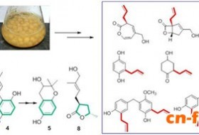 中国科学院昆明植物研究所植物化学与西部植物资源持续利用国家重点实验室活性天然产物发现与生物合成团队曾英研究组近年来同刘吉开研究组合作,致力于高等真菌天然产物的生物合成研究。2013年运用13C同位素标记谱、定量核磁共振以及代谢谱技术,结合酶化学与基因表达实验证据,揭示了韧革菌素奇妙的生物合成途径,证明其罕见的4/5融合双环内酯骨架既不是聚酮也不是倍半萜来源,而是由莽草酸与苯丙氨酸途径的芳环衍生而来(Angew. Chem. Int. Ed. 2013, 52 (8), 2298-2302)。2016年结合有机化学和生化与分子生物学技术,通过前体指导的生物合成策略,进一步研究了褐盖韧革菌混源萜类化合物骨架结构多样性的产生,阐明了由异戊烯基对羟基苯甲醇通过发散途径形成韧革菌素类混源萜的生物合成机制(Angew. Chem. Int. Ed. 2016, 55 (18), 5463-5466)。