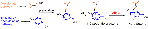 在韧革菌素的生物合成途径中,七元内酯环化合物氧杂环庚三烯-2(3H)-酮发生分子内碳-碳环合反应生成4/5融合双环内酯骨架结构,类似的环合反应及催化酶在生物合成中均未见报道,其中很可能蕴含新颖的酶学机制与催化机理。近期,曾英研究组与刘吉开研究组、黄胜雄研究组合作,通过酶活性导向的蛋白质逐级分离与蛋白组学技术获得22个候选蛋白,结合基因克隆、异源表达及酶活检测,确定了其中的一个α/β水解酶为韧革菌素环合酶(Vibralactone Cyclase, VibC),并对其酶学性质进行了研究。进一步通过酶化学实验、蛋白晶体、化学模拟计算及氨基酸定点突变实验,揭示VibC的催化机理为开环-aldol-酯化反应或去质子化-周环反应。韧革菌素环合酶为首例自然酶促aldol反应或电环合反应的α/β水解酶,VibC的发现丰富了天然产物生物合成中aldol反应酶及周环酶的分子机制与催化机理,扩展了α/β水解酶的自然催化反应类型,为后续合成途径重建,实现韧革菌素的异源生物合成,并开展结构衍生化研究奠定了基础。