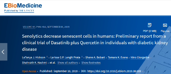 2019年09月18日,科学家们在EBioMedicine上发表了抗衰老1期临床试验数据。这个试验招募11位糖尿病肾病患者,使用3天达沙替尼(100 mg/day)、槲皮素(1000 mg/day)组合。结果显示:11天后这些患者脂肪、皮肤中表达p16INK4A-和p21CIP1-的衰老细胞有所下降,与衰老相关细胞因子如IL-1α, IL-6, MMPs-9 和 12水平也有所下降。这是Senolytic药物首次在临床试验中显示短期治疗可以有较持续清除衰老细胞功能。
