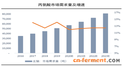 当下全球氨基酸年度总产量超过 800 万吨,预计到2022 年世界氨基酸总销量将达到1,105 万吨,市场规模达到 354 亿美元,而我国则已成为氨基酸产品主产的世界工厂。丙氨酸作为氨基酸一个分类,近年来市场需求保持着快速增长。据中国生物发酵产业协会数据显示,2019 年丙氨酸系列产品全球需求量约 5万吨,预计未来市场仍将会以约 12%的年复合增长率快速增长,到 2023 年全球市场需求可达 8.1 万吨。华恒的丙氨酸产品生产规模位居国际前茅,已成为全球范围内规模最大的丙氨酸系列产品生产企业之一。未来在下游市场迅猛发展的驱动下,丙氨酸市场仍将保持快速增长,如下图: