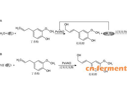 图1 分别由PsVAO和PsVAO-过氧化氢酶催化的松柏醇合成反应