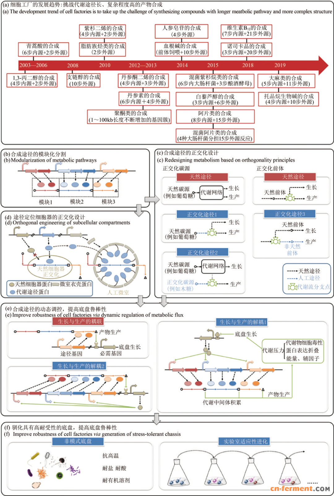 构建细胞工厂从头合成生物基材料单体1,3-丙二醇和重要医药中间体青蒿酸,开创了传统石化产品和天然产物全新的生产模式,可有效解决石油化工炼制和植物提取对自然资源的依赖和对环境的危害。自此,细胞工厂的设计构建成为合成生物学的一个重要研究方向。伴随着合成生物技术的进步,人们在逐步挑战代谢途径更长、复杂程度更高的化合物合成[图3(a)]。尤其是近期阿片类药物和大麻素的从头合成,展示了构建细胞工厂的巨大潜力。细胞工厂的设计构建,是通过对复杂生命体的工程化重构,实现目标产品的可控和高效合成。其实现过程是在物质代谢和能量代谢水平上,反复进行模块与模块、模块与底盘之间的适配。除适配性外,细胞工厂的发展趋势还承袭了模块化、正交性、鲁棒性等工程化特性。