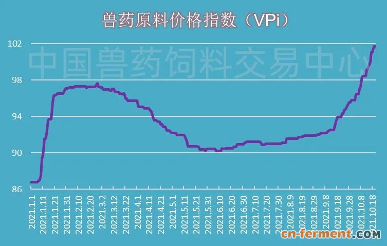 20日,兽药原料药价格指数(VPi)收于101.72,时隔三年,VPi再次突破100。仅从VPi指数来看,目前兽药原料药价格已经处于近几年来的高点。