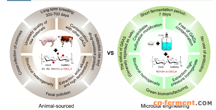 然而,当前所有商业化的 CS 主要依赖于动物组织提取(例如,牛、猪、鸡或鲨鱼等)。这种生产模式存在许多问题,例如动物饲养周长、抗生素的使用、动物排泄物的污染、使用高温及酸碱提取、产品存在潜在的致病因子及产品结构不均一等。因此,为了有效解决上述问题,开发一条新的 CS 绿色合成路线显得十分必要。