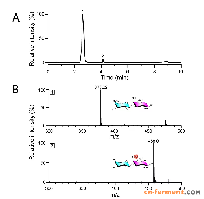 图 5. HPLC-MS 分析软骨素和硫酸软骨素二糖的离子色谱图(A)和质谱图(B)。