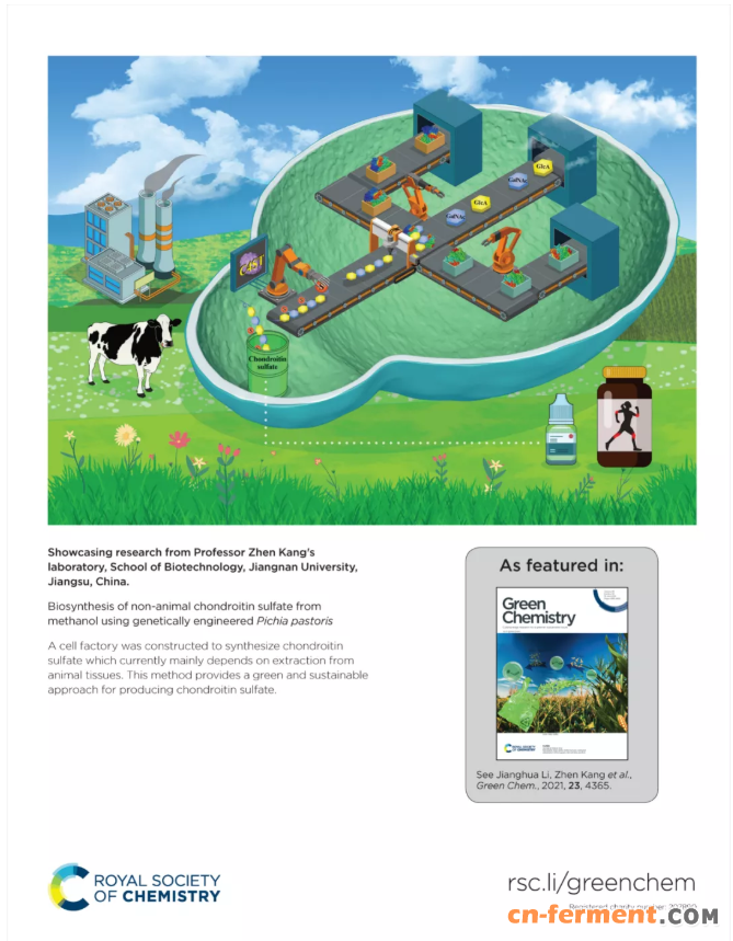 近日,江南大学康振教授课题组通过工程化毕赤酵母,利用廉价的甲醇实现了非动物源硫酸软骨素的从头合成。该成果以“Biosynthesis of non-animal chondroitin sulfate from methanol using genetically engineered Pichia pastoris”为题发表在英国皇家化学会期刊 Green Chemistry 上,文章被选为封面 (back cover)和热点(hot spot) 文章。