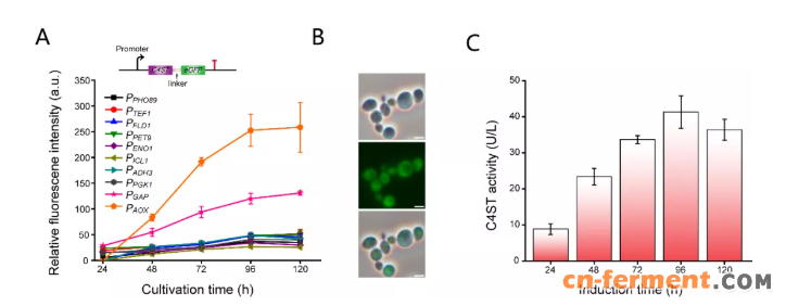 图 4. C4ST 表达的优化。(A) 10 种不同的毕赤酵母内源启动子表达 C4ST,通过 C 端融合 eGFP 指示蛋白表达情况。(B) C4ST-GFP 在 P. pastoris 细胞中的分布情况。比例尺=2.5 µm。(C) 不同时间下 C4ST 细胞内酶活的变化。