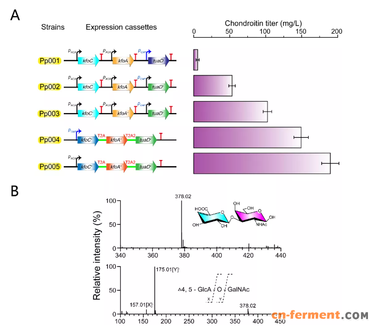 图 3. 毕赤酵母合成软骨素菌株的构建及软骨素结构分析。(A)软骨素合成途径的构建与优化。kfoC'、kfoA' 和 tuaD' 分别为 kfoC、kfoA和 tuaD 根据 P. pastoris 密码子偏好性优化后的序列。T2A 和 T2A2 代表自切割端肽。(B)从毕赤酵母中提取的软骨素二糖的质谱图。通过 HPLC-MS(上)和 MS/MS(下)分析软骨素二糖。