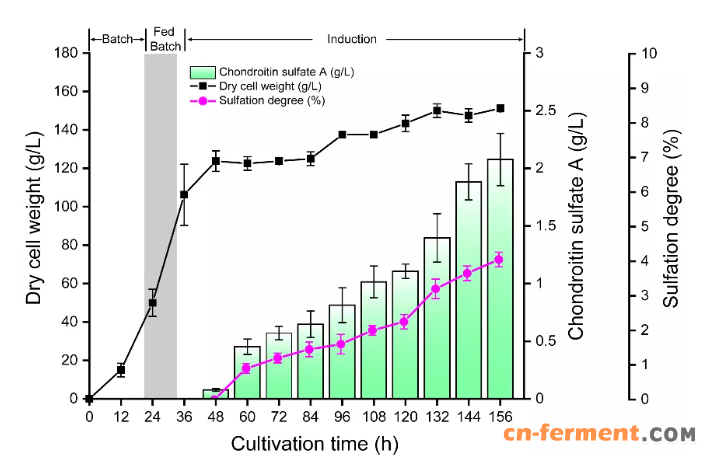 图 7. 通过重组菌株 Pp008 的补料分批发酵生产硫酸软骨素。首先,从 22 小时到 33 小时,以 8 mL/(L·h)的速度流加 50% (m/v)甘油。此后,在 33 小时甘油补料终止,然后在 36 小时残留甘油消耗完后进入甲醇补料培养阶段。每 12 小时取样检测一次细胞干重、磺酸化程度和硫酸软骨素 A 的滴度。