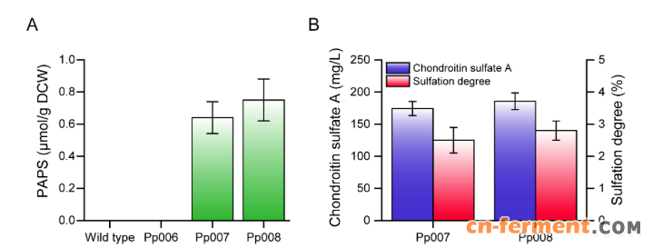 图 6. 增强 PAPS 合成以提高 CSA 的磺酸化度。(A) 不同重组菌株细胞内 PAPS 的水平。DCW,细胞干重。(B) Pp007 和 Pp008 菌株中硫酸软骨素的滴度和磺酸化程度。其中 Pp006 是没有强化 PAPS 合成途径的重组菌株,Pp007 和 Pp008 菌株分别过表达了来自酿酒酵母和毕赤酵母的腺苷 5'-三磷酸硫酸化酶(ATPS)和腺苷 5'-磷酸硫酸激酶(APSK)的编码基因。