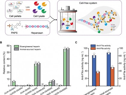 为了有效解决硫酸软骨素生产过程中的问题,作者通过工程化的毕赤酵母,利用廉价的甲醇从头合成 CS。首先,将来自大肠杆菌 K4 的 kfoC 和 kfoA,及来自枯草芽孢杆菌的 tuaD 三个外源基因引入毕赤酵母,构建软骨素合成途径,得到 5.5 mg/L 的软骨素合成菌株。进一步通过密码子及基因组合优化,软骨素的产量提高了约 35 倍,达到 189.8 mg/L。对 6 种 Kozak 序列和 10 种不同的内源启动子进行比较和分析,实现了软骨素-4-O-磺基转移酶的活性表达(41.3 U/L)。整合软骨素合成模块和磺酸化模块后,工程菌株 Pp006 成功合成了 182.0 mg/L CS [GlcA-GalNAc (4S)],磺酸化度为 1.1%。通过过表达腺苷 5'-三磷酸硫酸化酶和腺苷 5'-磷酸硫酸激酶,强化了 3'-磷酸腺苷-5'-磷酸硫酸(PAPS)的供给,进一步将硫酸化度提高到 2.8%。在 3-L发酵罐分批补料培养中,CS 最高产量达到 2.1 g/L,硫酸化度提高到 4.0%。本研究为毕赤酵母细胞工厂代谢合成其他磺酸化糖胺聚糖奠定了基础。