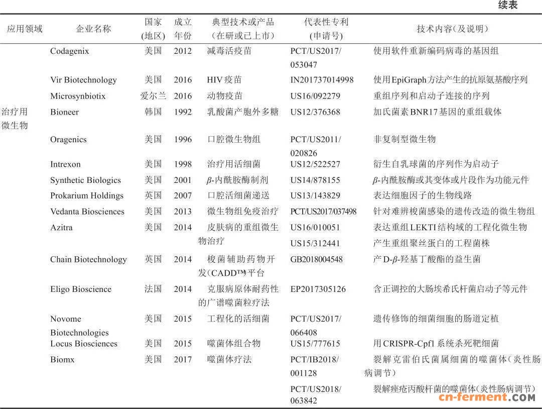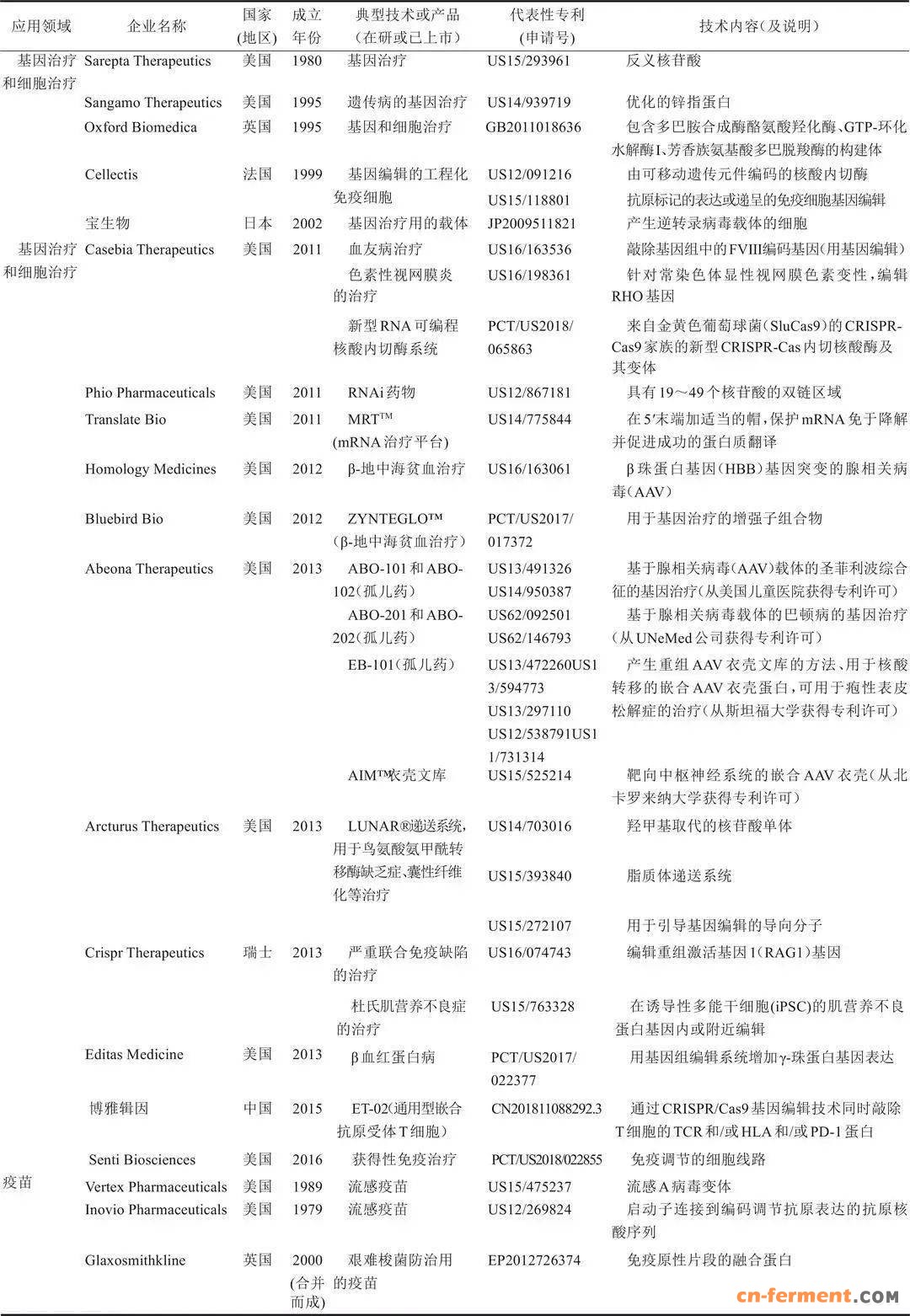表3 合成生物学在疫苗和治疗领域应用的企业技术或产品及其代表性专利(例举)