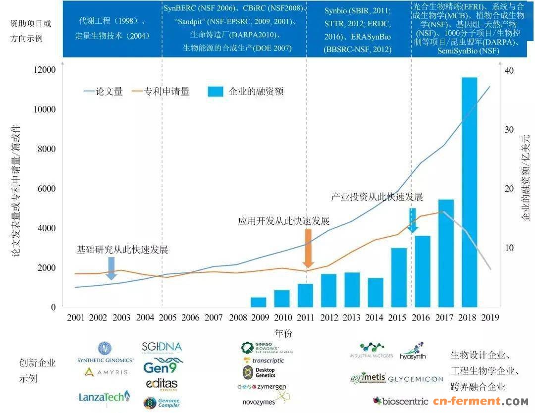 图1 2001-2019年合成生物学的论文、专利和融资和企业发展情况
