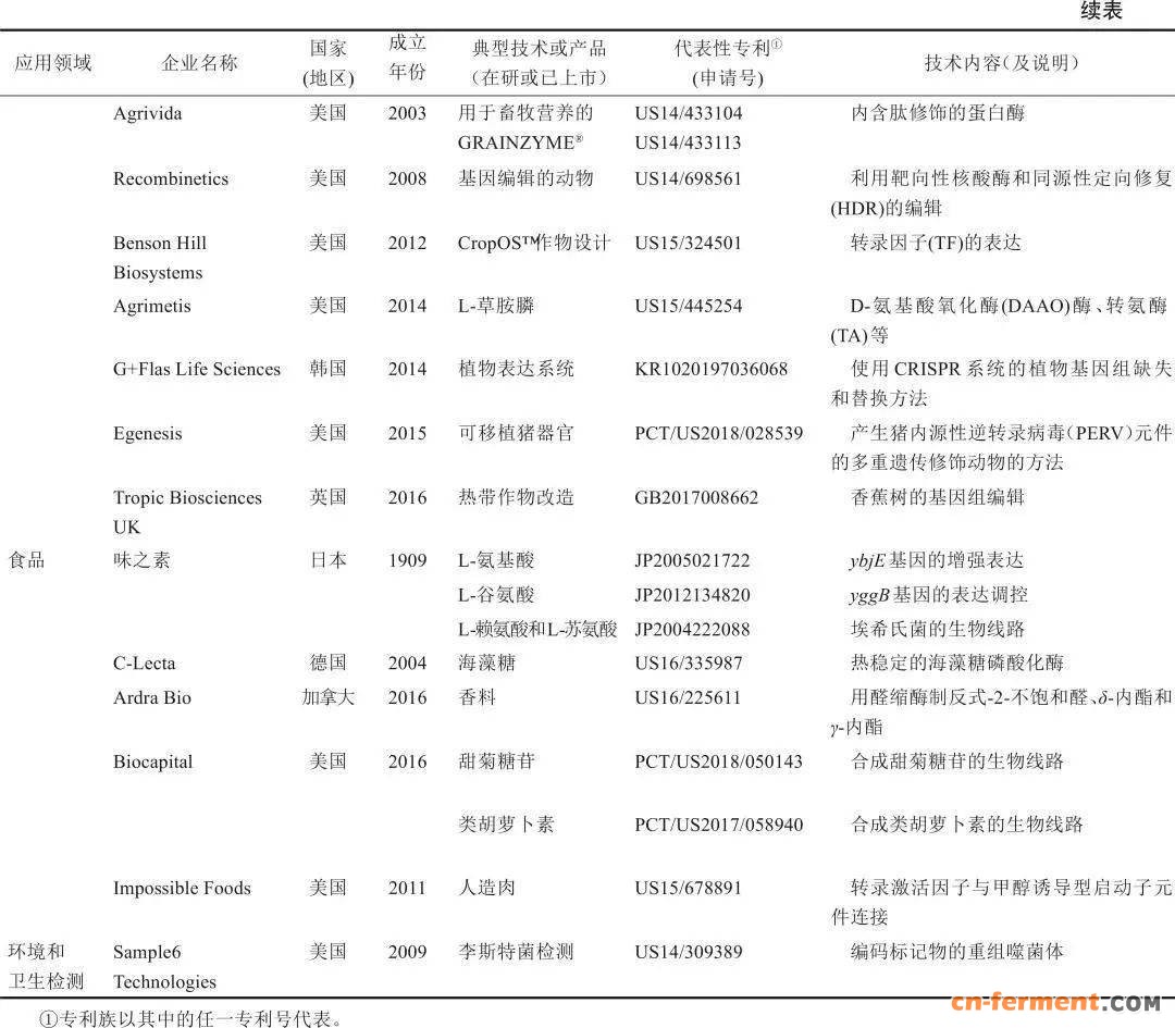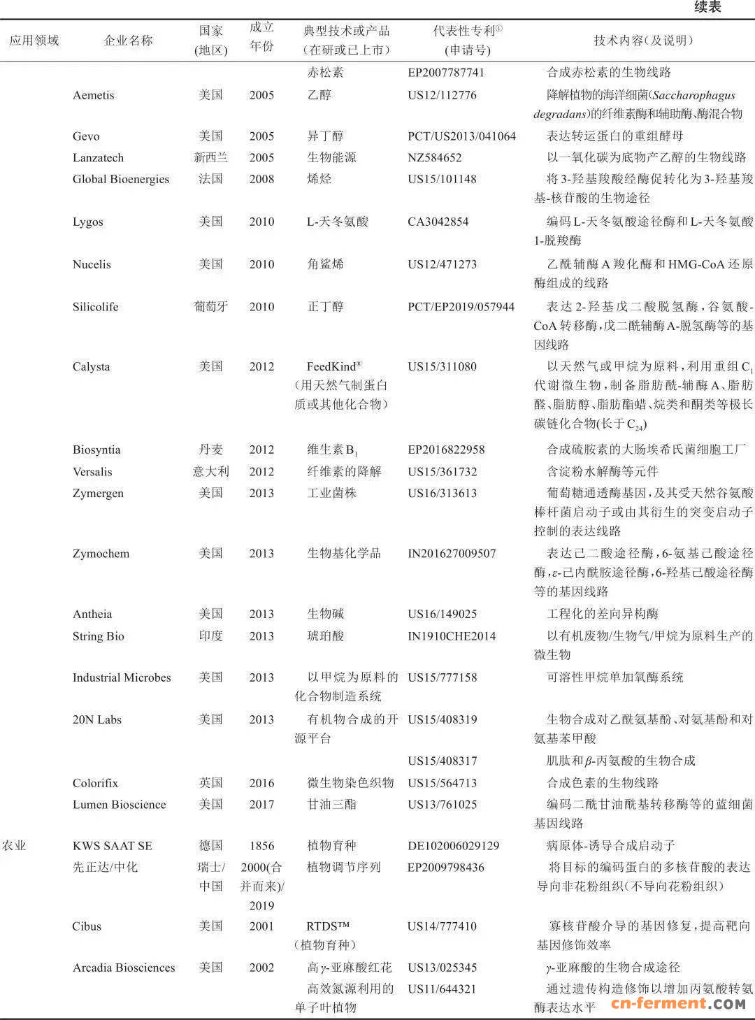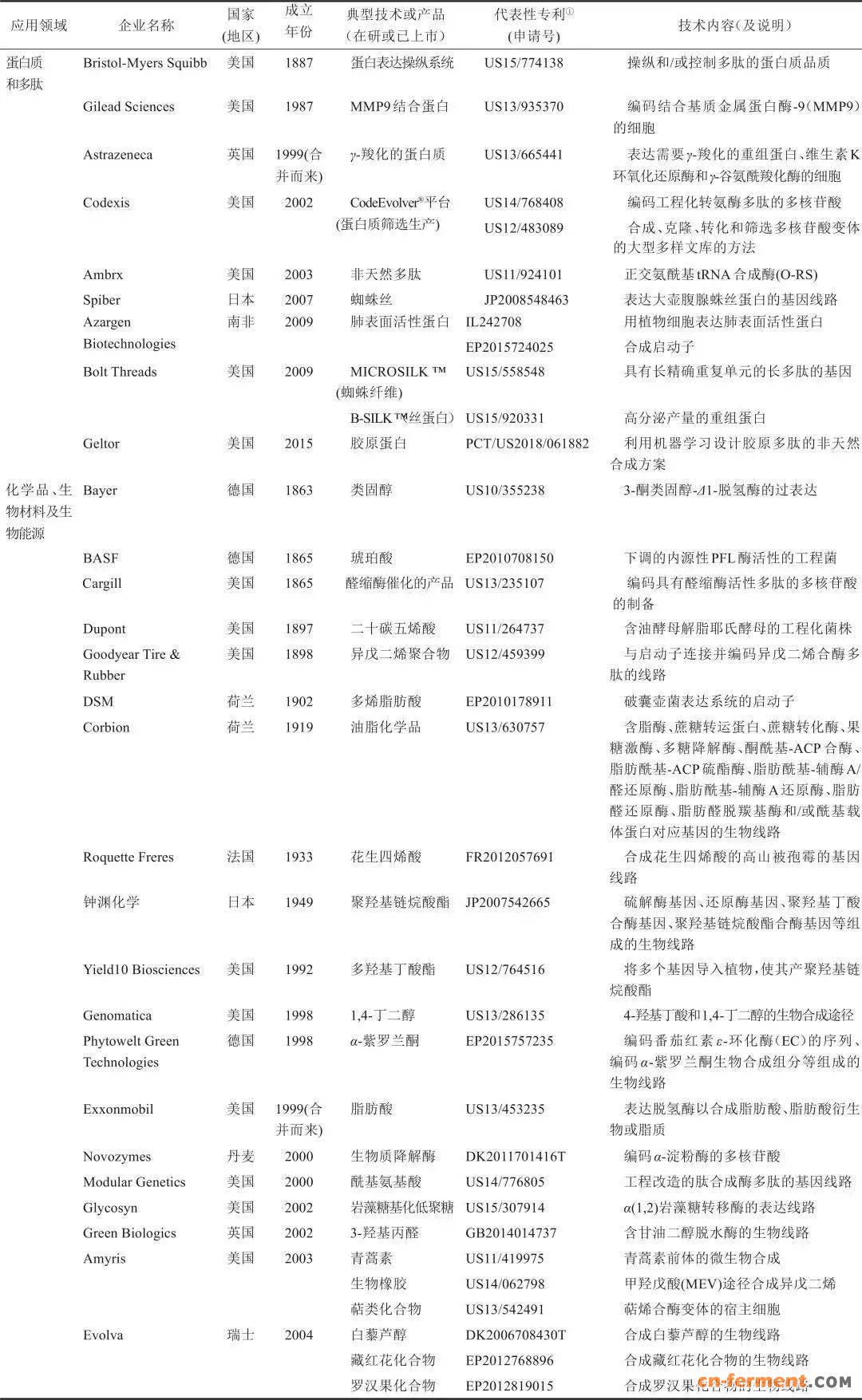 表4 合成生物学在其他领域应用企业的技术或产品及其代表性专利(例举)