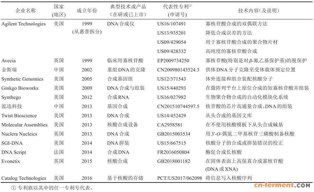 表1 核酸与基因组合成企业的技术或产品其代表性专利(例举)