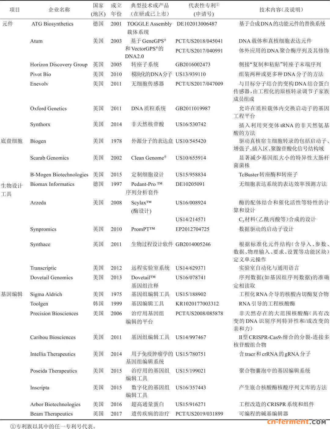 表2 合成生物学元件、底盘细胞、设计工具和基因编辑企业的技术或产品及其代表性专利(例举)