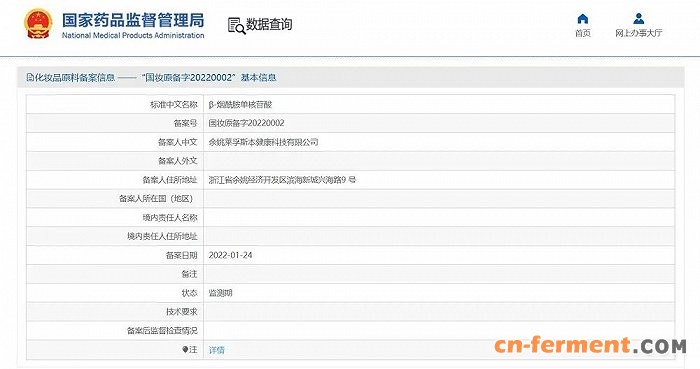 根据国家药监局化妆品原料备案信息平台公开的新原料β-烟酰胺单核苷酸(简称NMN)的备案信息,其备案时间为2022年1月24日,由余姚莱孚斯本健康科技有限公司申请,目前状态处于监测期。