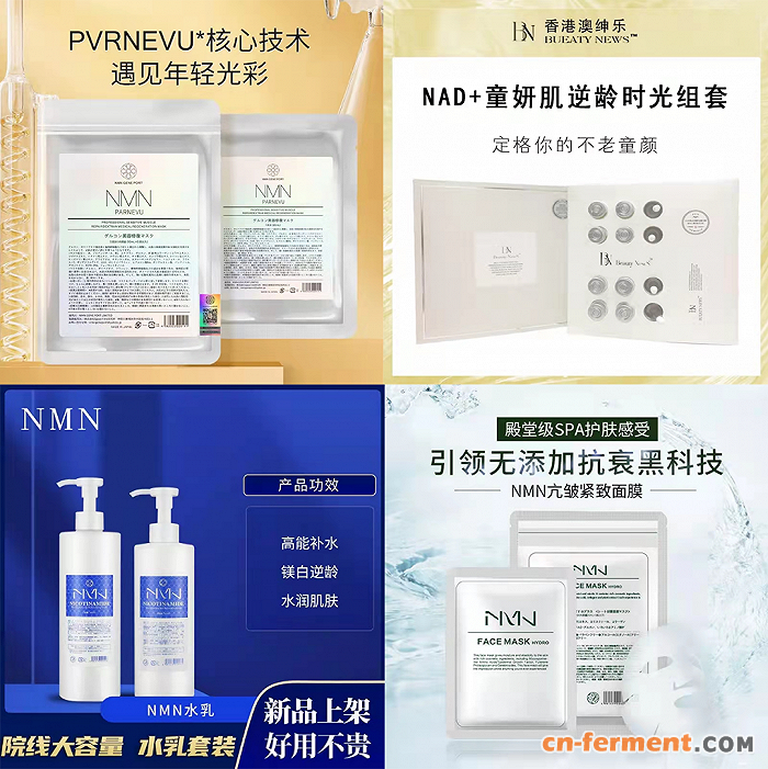 尽管目前关于NMN在皮肤上的研究较少,但市面上仍然有不少主打NMN的化妆品,其中以水乳、面膜、洁面为主,大多数来自日本、香港等国家、地区,相关产品通常带有“逆龄”、“抗皱紧致”的关键词。