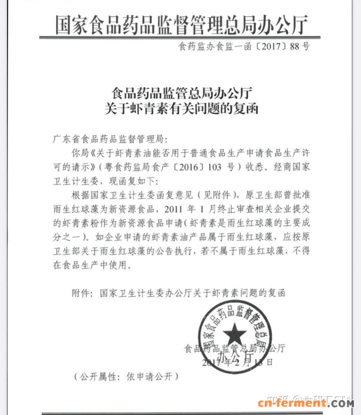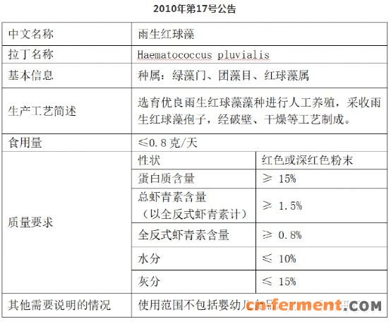 我国已于 2010 年第 17 号公告批准雨生红球藻为新资源食品,雨生红球藻来源的虾青素已可以添加到除婴幼儿食品的各类食品饮料中。我国目前是虾青素原料的出口大国,但虾青素产品在我国的市场还处于初级阶段,相关的应用仍非常稀少,尚待进一步的开发利用。