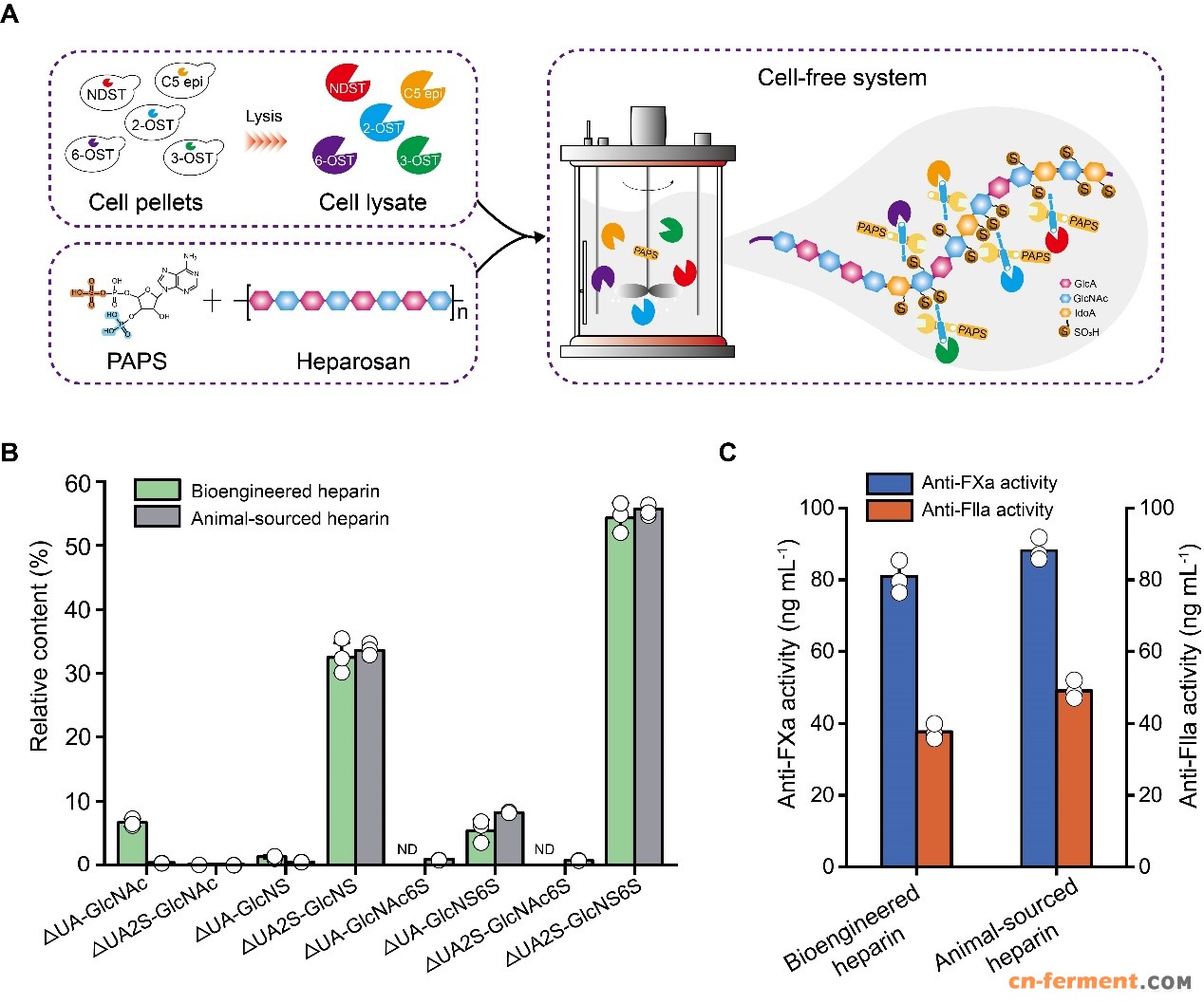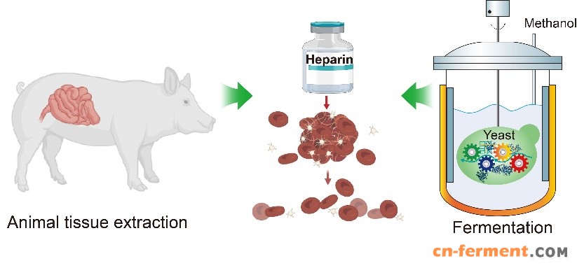 肝素是医学上最广泛的抗凝药物,用于临床血栓、心梗等疾病治疗。目前市场上肝素依赖于猪小肠等动物组织提取。肝素在脊椎动物中发挥着多种作用,如胚胎发育、抗菌 / 病毒感染(如 COVID-19 )、抗炎症反应和血液凝固等。动物源肝素中其他糖胺聚糖(如过磺酸化硫酸软骨素)的可变结构和污染加剧了医疗风险,阻碍了其结构 - 活性关系的研究。目前,已报道的肝素的合成方法有化学法和化学 - 酶法,但其面临着步骤繁琐或者高成本等障碍。针对现有问题,研究人员开发了一种绿色、简便、易培养的微生物平台合成生物工程肝素,具有与动物源肝素相似的抗凝血活性。