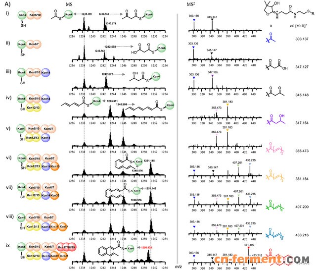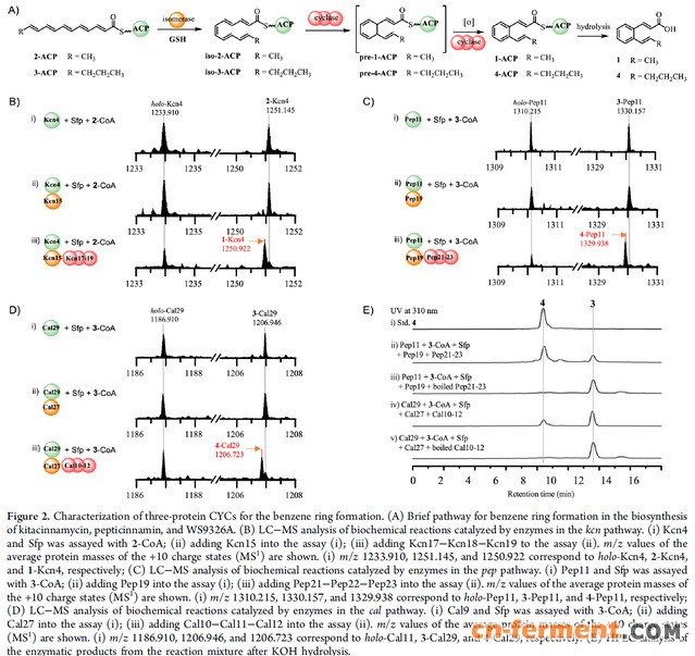 受到Kcn17-Kcn18-Kcn19催化功能的鼓舞,我们考虑是否其他同源蛋白也可以催化苯环的形成。于是表达了化合物pepticinnamin和WS9326A生物合成基因簇上的相关蛋白,且化学合成了可能的多烯底物2和3。将2和3连在相应ACP上作为底物,体外验证相应的异构酶和三蛋白复合体的功能,均能产生相应的环化产物。因此,我们的结果表明,三种蛋白复合物Pep21-Pep22-Pep23和Cal10-Cal11-Cal12,分别负责pepticinnamin和WS9326A生物合成中肉桂酰部分苯环的形成。(Figure 2)