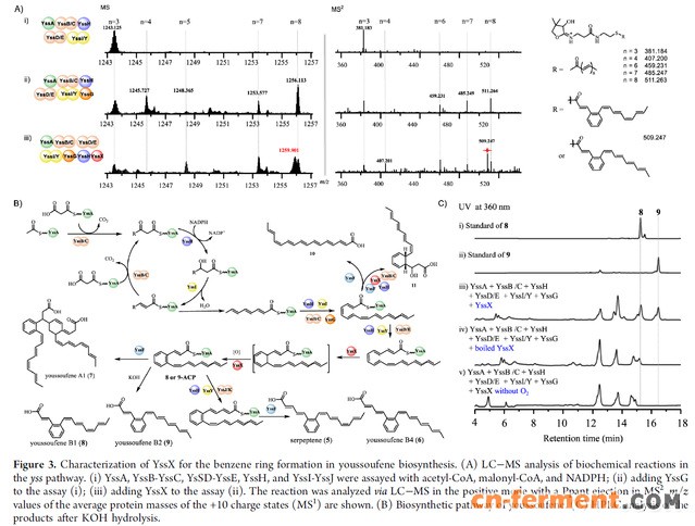 与这些通过酰胺键与氨基酸残基结合的肉桂酰部分不同,youssoufene是独特的游离肉桂酸类。先前有文献报道youssoufene生物合成过程中的多烯中间体由HR Type II PKS负责催化形成,然而负责苯环形成的酶仍是未知的。我们发现在其生物合成基因簇中并没有Kcn17-Kcn18-Kcn19的同源蛋白,但是与已报道的ysf基因簇相比,我们的yss基因簇上多了一个仅含有59个氨基酸的小蛋白YssX。敲除yssX后,终产物不再产生,证明YssX与youssoufene的生物合成相关。为验证YssX的功能,我们在体外重构了youssoufene的生物合成过程,与Kcn17-Kcn18-Kcn19功能类似,YssX催化了苯环的形成。至此我们阐明了youssoufene的完整生物合成路径。(Figure 3)