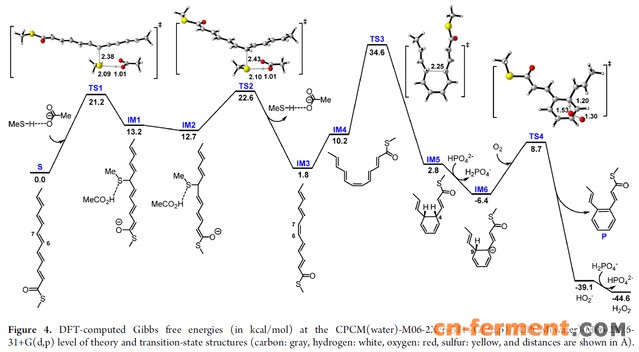 了更好地理解苯环形成的反应机理,我们对从多烯S(模拟2-ACP)开始的一系列反应进行了密度泛函理论(DFT)计算,进一步支持了三蛋白复合体Kcn17-19或蛋白YssX在生物合成中的催化作用。(Figure 4)