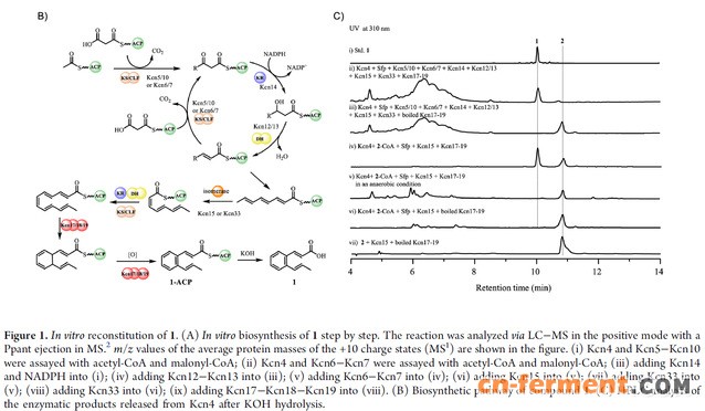 在前期的研究中,我们通过基因挖掘发现了一类含有肉桂酰基团的糖肽类化合物kitacinnamycins(Chem. Sci., 2019, 10, 4839-4846.)。鉴于这些CCNPs中特殊肉桂酰基团的生物合成步骤一直未被研究清楚,于是我们以kitacinnamycin为模型化合物尝试破译其生物合成路线。在本研究中,我们表达并获得了kcn基因簇上HR Type II PKS相关的蛋白,在体外成功重构了kitacinnamycin中肉桂酰基团的合成。简言之,ACP、KS/CLF、KR、DH以乙酰辅酶A和丙二酰辅酶A作为底物,经三轮延伸后合成了C8-三烯化合物;继而在异构酶的作用下第三个双键发生异构,随后又经历两轮延申形成C12-五烯底物;最后三蛋白复合体Kcn17?Kcn18?Kcn19可以催化C12-五烯底物发生6π-电环化并脱氢生成苯环(Figure 1)。