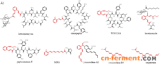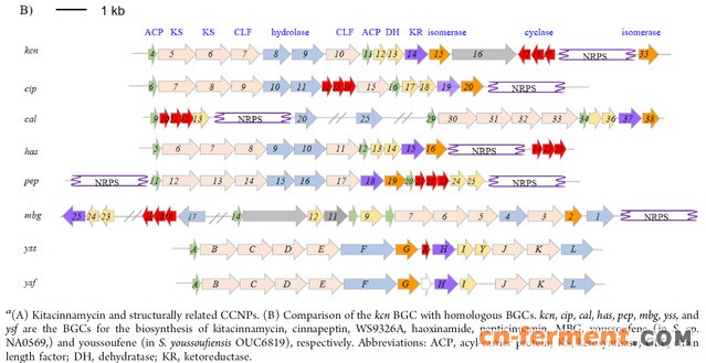 此外,近几年有少量含肉桂酰基团的天然产物(CCNPs)被报道,例如skyllamycin, WS9326A, haoxinnamide, pepticinnamin, atratumycin, youssoufene等等均具有抗菌、细胞毒和抗结核活性。肉桂酰基团的生物合成被认为是由一种特殊的高度还原(HR)的II型聚酮合成酶(PKS)催化的(Scheme 1)。然而,其生物合成路线,特别是苯环形成的环化步骤仍不清楚。