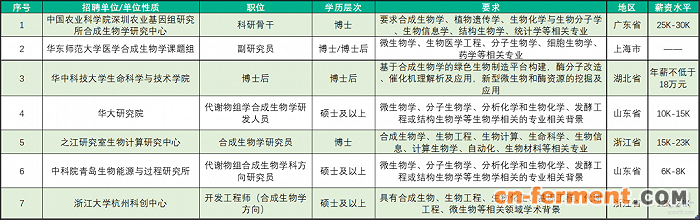 5、生物类、化学等学科方向人才与合成生物学人才需求紧密相关,复合型人才备受企业青睐。从下图“要求”那一栏中不难看出,不论是研究院所或是各大企业,都对招聘人员的学术背景提出了一定要求,其中,有生物类、化学等方向背景的人才是“硬”要求。合成生物学作为一个跨学科的研究领域,其需要的人才自然也以复合型人才居多,生物、化学、基因编辑……以及实操能力,合成生物学的未来或许就在科研人员的一次次实验中发出微光,然后在更大的市场上发光发热。