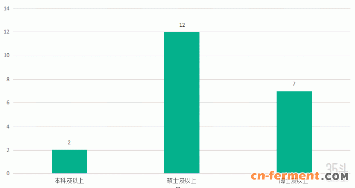 3、高学历是进入合成生物学行业的“敲门砖”。据下图统计数据显示,21家用人单位中,需要硕士及以上学历的单位数量达到了19家,超过统计总量的90%。高层次人才与一线从业者共同解决各行各业的关键应用难点,探究众多应用问题的科学本质与原理以推动行业进步是一大趋势。