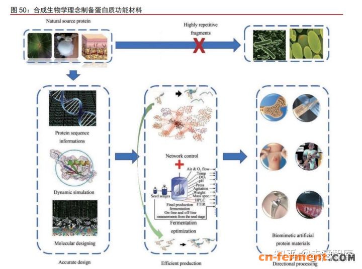 第三次生物技术革命的合成生物学技术,以“基因调控,工程设计”为核心,用于 产品的精准化设计与高效合成,致力于实现人类对可持续发展工业模式的期待。目前以 合成生物学的科学理念为指导,对生命体进行不断改造与优化,以实现细胞工厂定向合 成蛋白,结合理性设计的材料模块,赋予蛋白质在生产过程的智能可控以及性能的更新 升级是当下研究的热点。 动物源提取法:作为初代制取方式存在诸多问题,如受制于伦理和法律禁止使用人 体组织提取(如胶原蛋白的胚胎提取),以及存在排斥反应大、产品批次质量不均一、生 物功效不稳定等特点,严重阻碍了蛋白质功能材料的广泛应用。