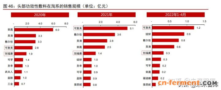 功效性敷料淘系销售额前十中仅可复美和创福康主打胶原蛋白成分,可复美 2021 年 起位列榜首。从成分看,淘系销售前十的功效性敷料以透明质酸和胶原蛋白为主,透明 质酸敷料主打保湿补水,胶原蛋白敷料侧重修复再生,部分敷料添加了抗菌消炎成分用 于祛痘舒缓。根据魔镜市场情报 2020 年/2021 年/2022 年 1-4 月数据,可复美在淘系销 售额分别为 2.8/5.1/1.2 亿元,创福康在淘系销售额分别为 1.9/1.4/0.3 亿元。