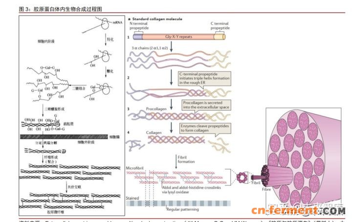 胶原蛋白的自然生物合成过程复杂,主要分为两个阶段,前期在细胞内,后期在细 胞外。细胞内:1)α-肽链的合成。通过相应 mRNA 在细胞粗面内质网上形成α-肽链, α-肽链拥有 6 个区,其中三螺旋区为连续的 Gly-X-Y 氨基酸重复序列,Gly 为甘氨酸 (Glycine),X 常为脯氨酸。2)羟基化修饰。α-肽链中脯氨酸、赖氨酸残基经羟基化形 成胶原蛋白中特有的羟脯氨酸和羟赖氨酸,羟脯氨酸有利于在肽链之间形成氢键,使 3 条α-肽链相互结合并扭转成三螺旋。羟化作用对三螺旋的稳定性有重要作用,羟基化程 度越高,胶原蛋白的变形温度越高,相应越稳定。3)糖基化修饰。糖基化作用目前尚未 完全阐明。经羟基化和糖基化修饰的 3 条α-肽链形成三螺旋结构的前胶原蛋白,并排至 细胞外。