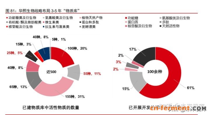 华熙生物开展战略性布局,围绕服务于人类生命健康的生物活性物和材料,布局未 来 3-5 年可以发掘和创造的活性物质库。已建立的活性物质库中拥有近 500 种活性物质, 覆盖不同类别,其中蛋白和多肽占比 5%,约 25 种;氨基酸及衍生物占比 11%,约 55 种。目前已经开展了一百多种活性物质的开发,重点围绕功能糖、氨基酸衍生物、蛋白 质、多肽、核苷酸衍生物及天然活性物六大类进行开展,其中蛋白质占比 2%,约 2 种; 多肽占比 3%,约 3 种;氨基酸及衍生物占比 15%,约 15 种。