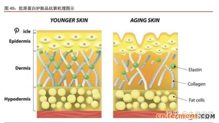 皮肤的衰老与胶原蛋白的流失密切相关。I 型胶原在皮肤中以纤维状构成弹力网,支 撑皮肤。III 型胶原可以维持皮肤饱满、润滑、有光泽。随着人体生长、老化,III 型胶原 逐渐流失,部分 I 型胶原发生交联或是断裂,成纤维细胞分泌胶原的速度降低,皮肤容易 失去支撑而产生局部皱纹。